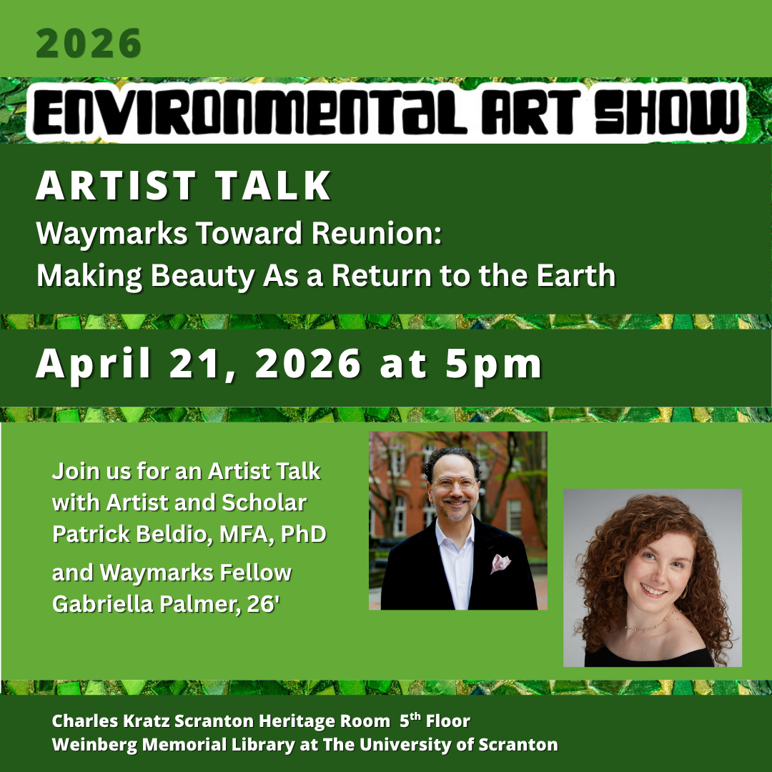 In conjunction with the closing of the Environmental Art Show, please join us for Waymarks Toward Reunion: Making Beauty As a Return to the Earth an Artist Talk with Patrick Beldio, MFA, Ph.D. and Waymarks Fellow Gabriella Palmer, 26′ on April 21 at 5pm in the Charles Kratz Scranton Heritage Room.